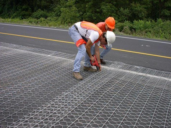 公路路面加筋石笼网是在普通石笼网的基础上,织网的时候多了一道工序,即在特定米数的地方,横向加上一根较粗的丝,专业术语为加筋丝。这种特殊的石笼网经常是以卷网的形式出现,应用在公路,铁路或是山坡的防护工程中。